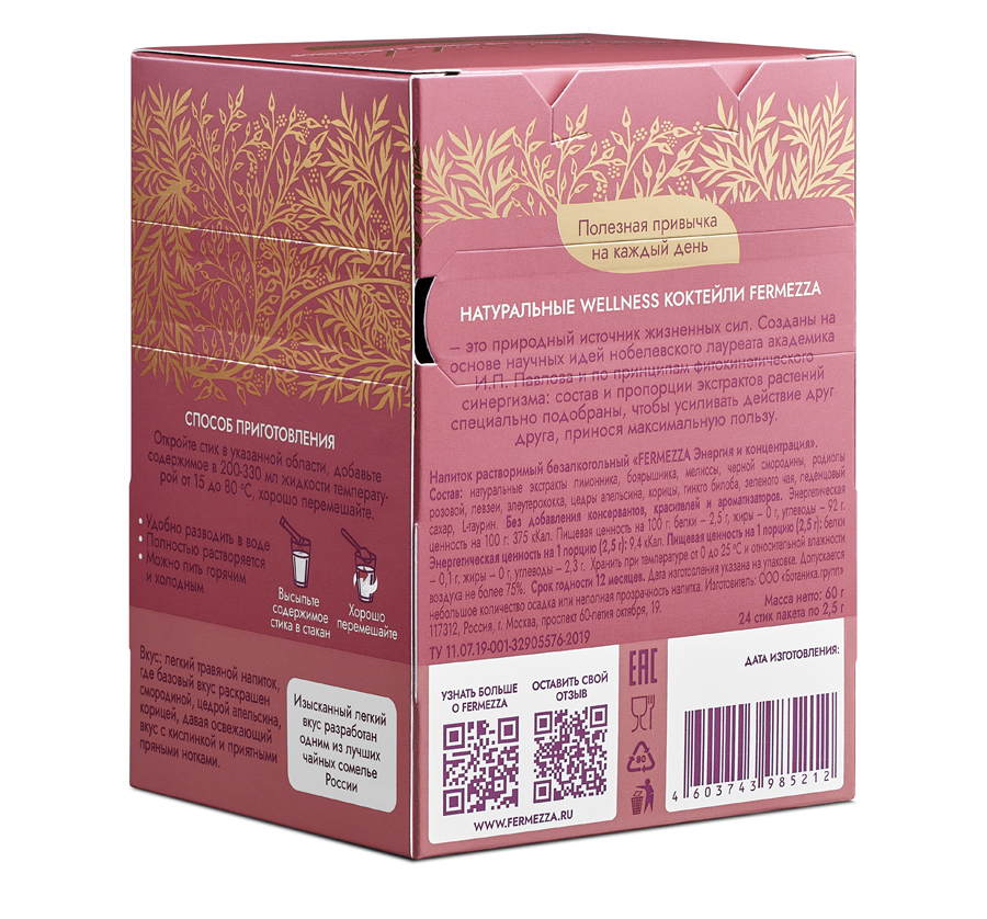 Състав:Натурални екстракти от шизандра (лимонник), глог, маточина, черно френско грозде, родиола розеа, левзея, елеутерокок, портокалова кора, канела, гинко билоба, зелен чай, леденцова захар и L-таурин.